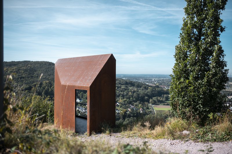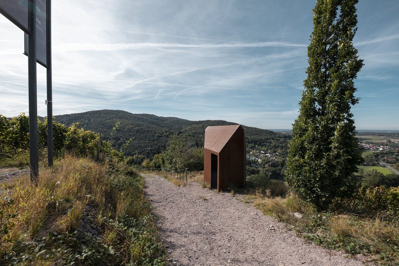In der Lage Michelbacher Apostelgarten bei Alzenau widmet sich dieser magische Ort dem Thema „Arbeiten im Weinberg – Tradition und Moderne“. Historische Weinbergshäuschen, Lesesteinriegel und die Steillage selbst sind Zeugen für die harte Arbeit im Weinberg. Inmitten dieser denkmalgeschützten Weinlage, von der der Blick in den Kahlgrund bis zur Skyline von Frankfurt schweift, setzt am terroir f nun ein neues Weinbergshäuschen einen spannenden Akzent. Seine architektonisch mutige Gestaltung aus Cortenstahl korrespondiert mit dem historischen „steinernen Häuschen“, das frisch saniert und in unmittelbarer Nähe zum terroir f das Wahrzeichen des Michelbacher Weinbaus darstellt.