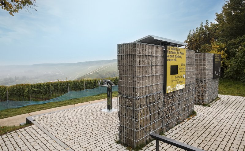 Hoch über Volkach, wo die Reben der großen Lage Escherndorfer Lump gedeihen, dreht sich dieser terroir f-Standort um das Thema „Klima und Klimawandel“ – schließlich ist der Escherndorfer Lump eine der heißesten Lagen in Franken. Wie stark hier die Sonne strahlt, zeigt ein bewegliches Photovoltaikelement. Auf den Stufen, die von den Reben hinauf zum Aussichtspunkt führen, prangen Zitate zur Erntemenge und zur Qualität von außergewöhnlichen Weinjahrgängen bis zurück ins Mittelalter.